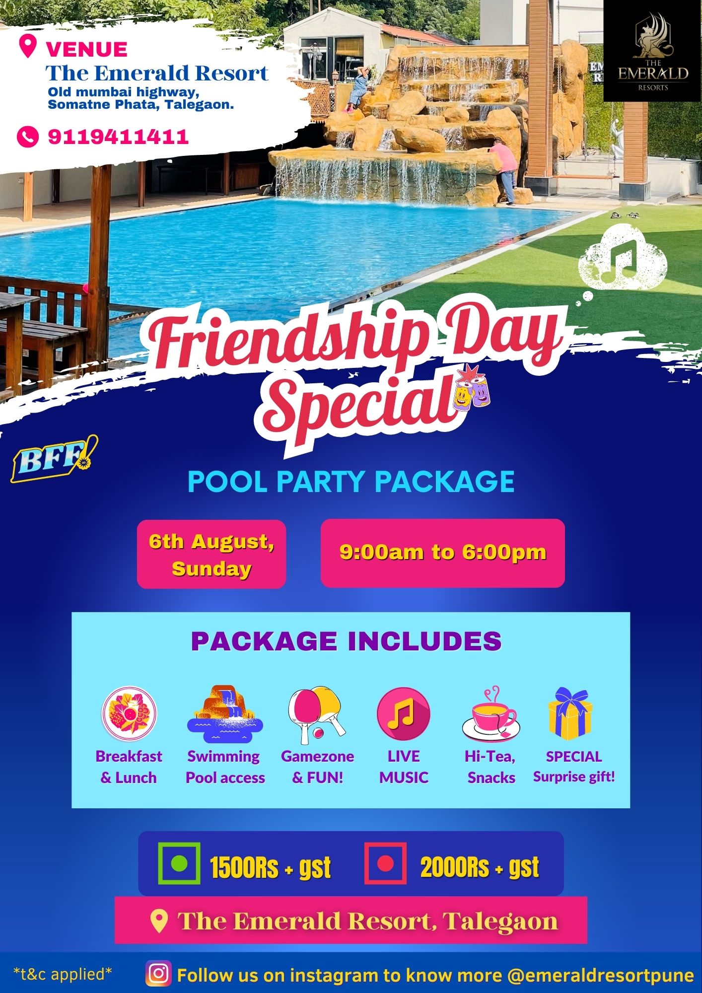 Celebrate your friendship day with us and build new connections! The Emerald Resort presents friendships day special POOL PARTY! Come with your friends and family and go home with heart full of satisfaction and tons of memories!! Call for reservations - 9119411411 What's included- Breakfast Lunch Hi-Tea (Chef choice menu) Pool access Game zone access Special Acitivies will be hosted for all guests Surprise Gift Resort Amenities Free parking Free WiFi